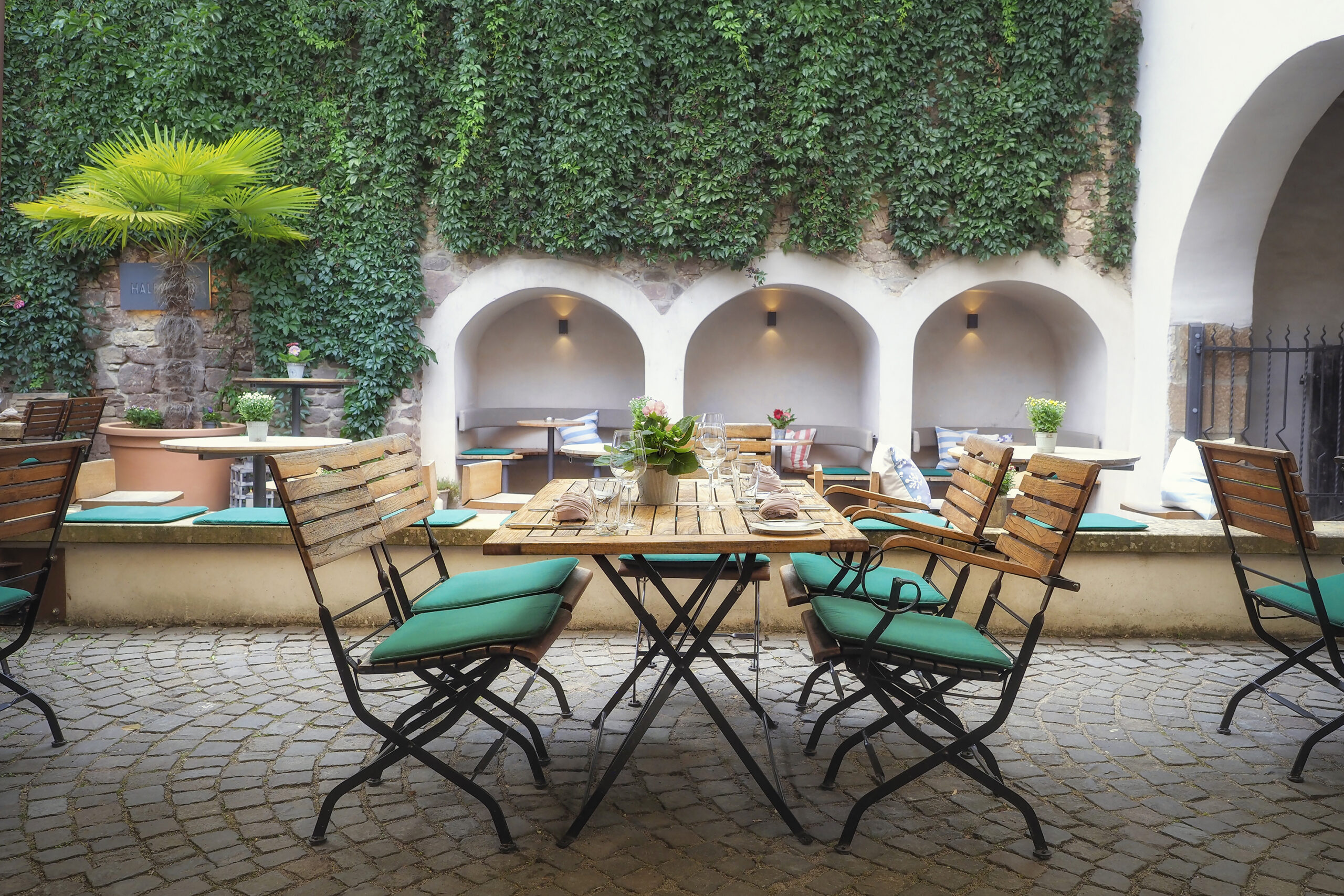 Sobald es die Temperaturen erlauben, können unsere Gäste in unserem stilvollen Innenhof speisen.